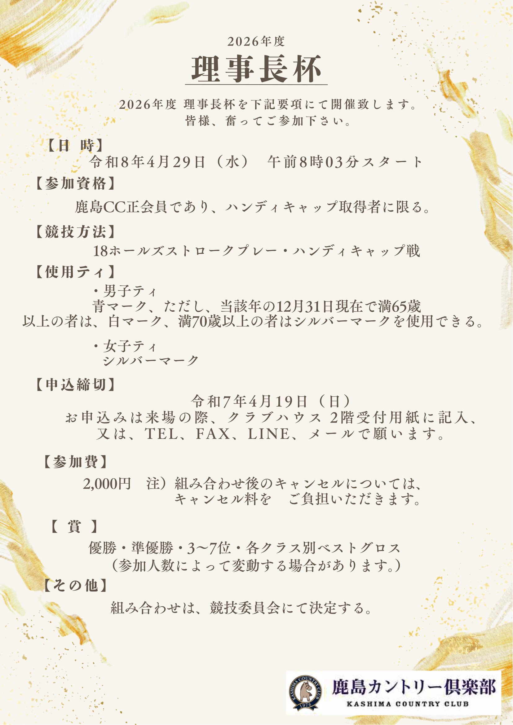 2026年度 理事長杯 2026 3/12 【4月29日(水・祝)】午前8:03スタート予定 皆様、奮ってご参加下さい。 ※鹿島CCメンバーに限ります。 ※申込締切:4月19日(日)まで お知らせ ゴールデンウィーク料金のご案内!