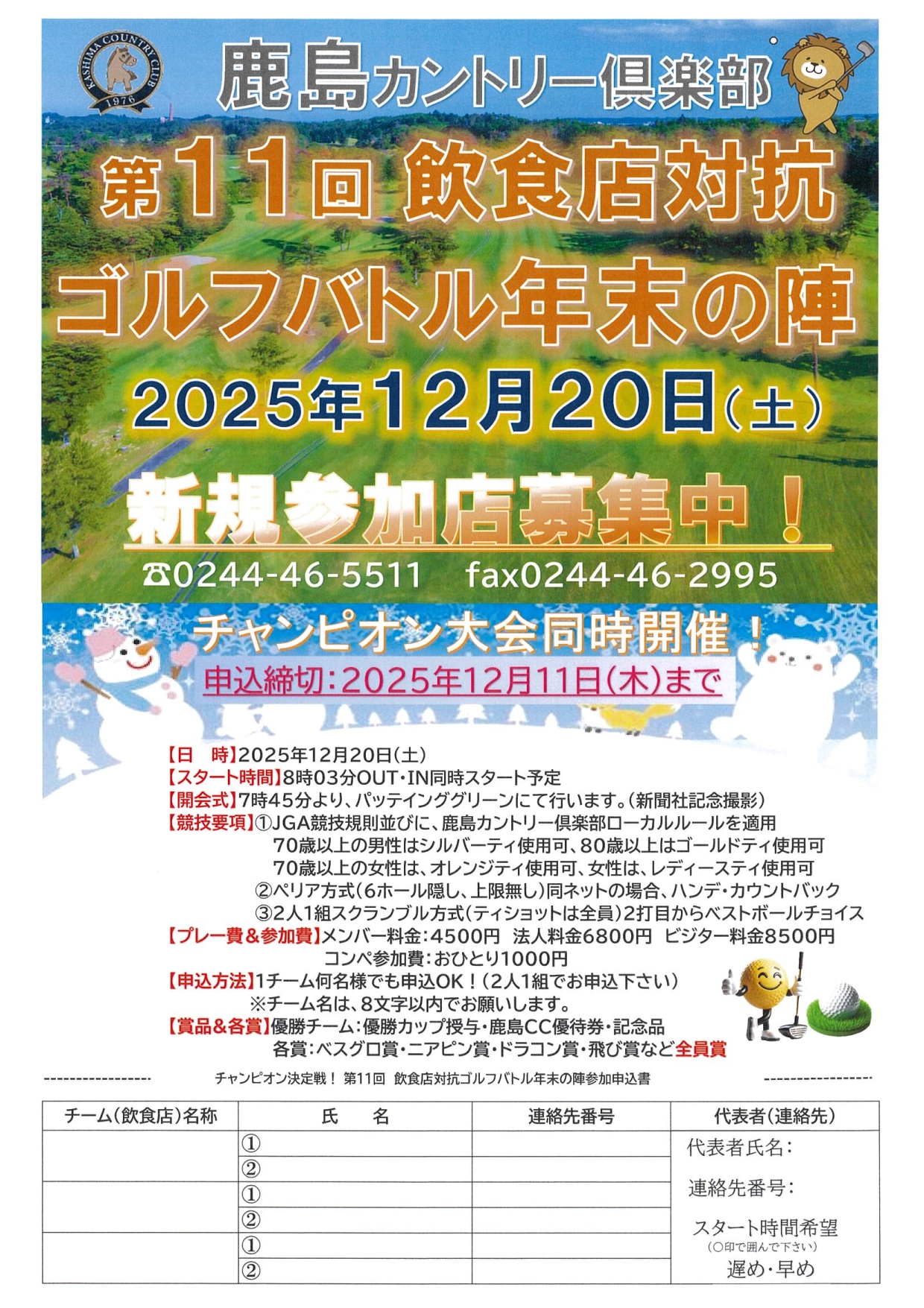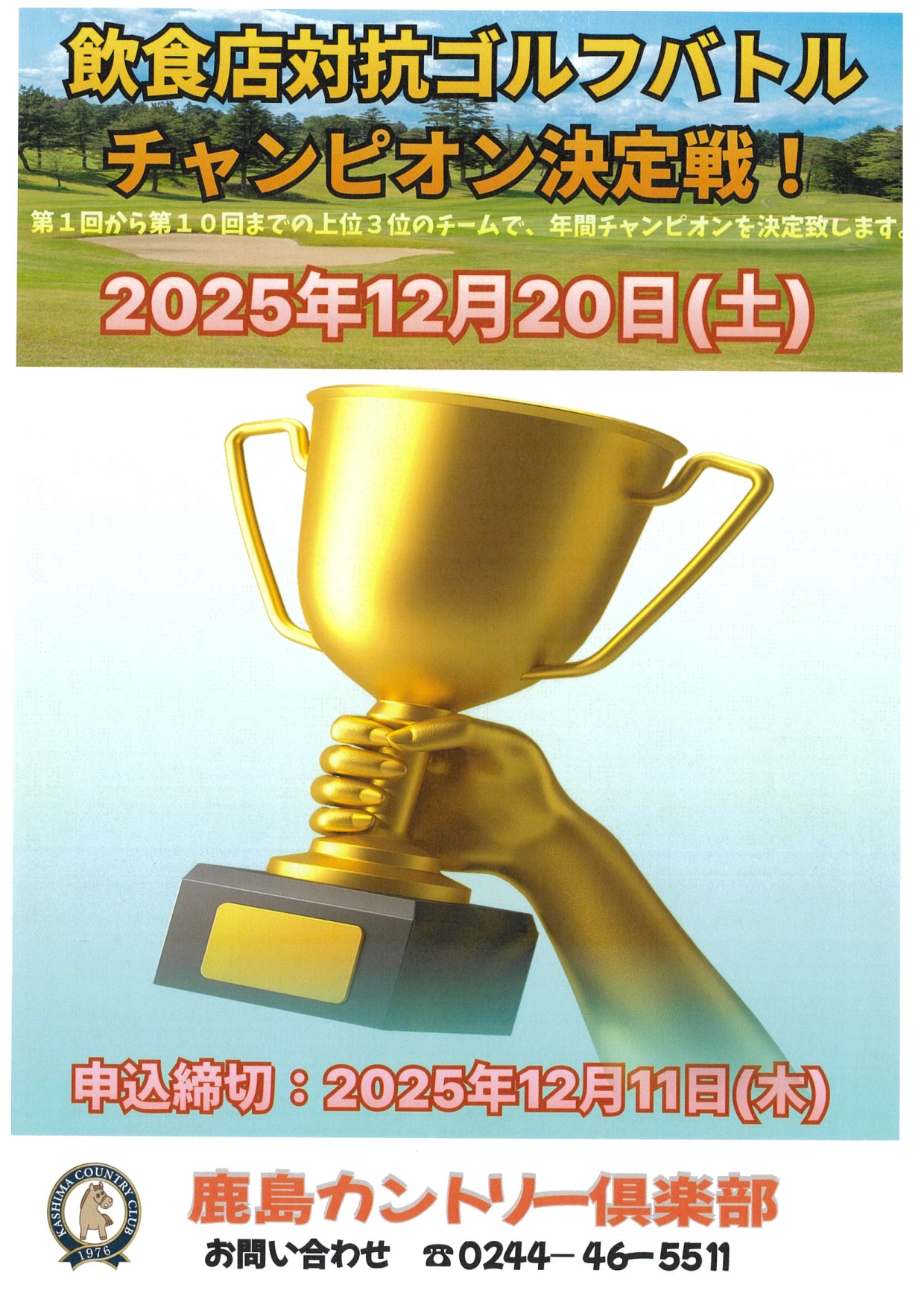 飲食店対抗ゴルフバトルチャンピオン決定戦&第11回飲食店対抗ゴルフバトル年末の陣開催! 2025 11/17 12月20日(土)同時大会開催!! チャンピオン決定戦は、第1回から第10回大会の上位3位入賞者で年間チャンピオンを決定いたします。 同時開催で第11回飲食店対抗ゴルフバトル年末の陣も開催します。 皆さんのご参加お待ちしております! お知らせ 年末年始ビジター料金のご案内 11月レディースハーフコンペ開催!